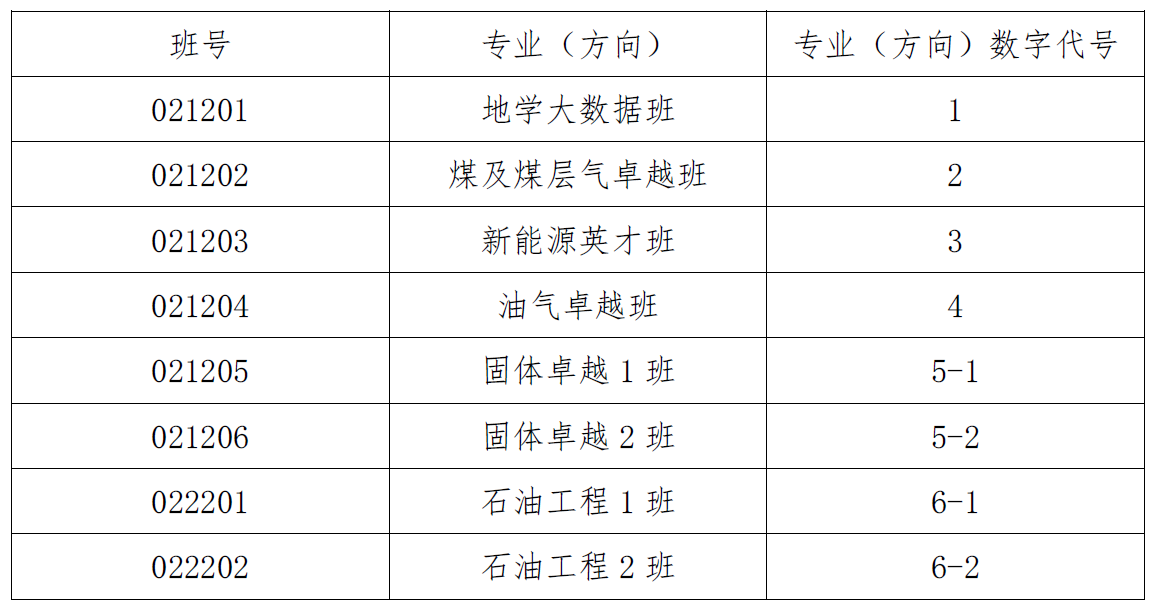 班号、专业(方向)及其数字代号如下: