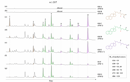 Beats365唯一官网入口朱钢添副教授团队选取南襄盆地泌阳凹陷原油作为研究对象,通过气相色谱-质谱(GC-MS)、全二维气相色谱-飞行时间质谱(GC×GC/ToF-MS),系统分析了一系列母源关系接近但生物降解等级不同的原油样品中的甾烷酸分布。GC-MS分析结果表明,在未降解和低降解等级的原油样品中,未检出甾烷酸信号,只有在生物等级较高(规则甾烷开始发生明显降解)的原油样品中才能检测到甾烷酸,说明该类酸性生物标志物是甾烷的生物降解产物(图1)。