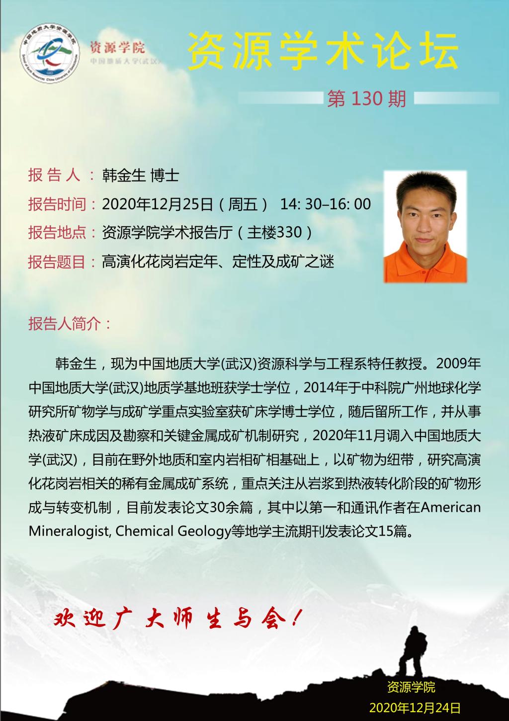 【12月25日】第130期资源学术论坛:韩金生学术报告