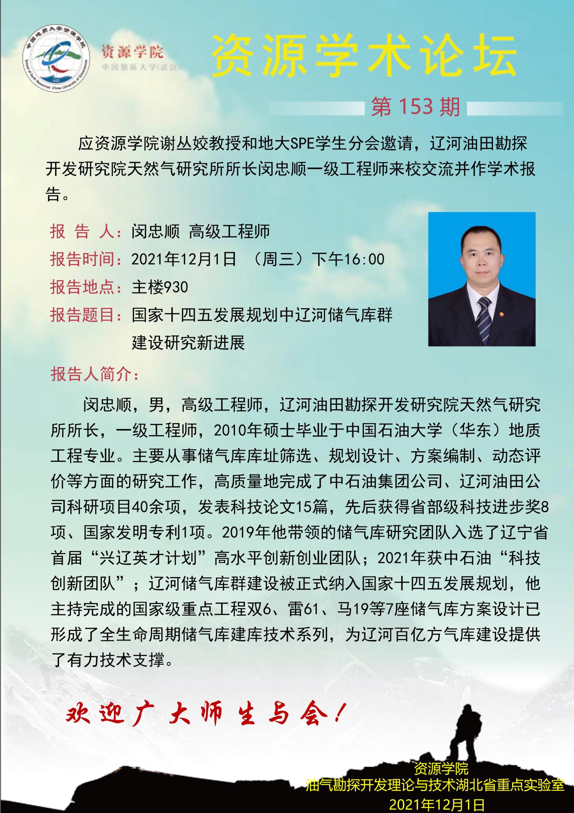 【12月1日】第153期资源学术论坛:闵忠顺学术报告