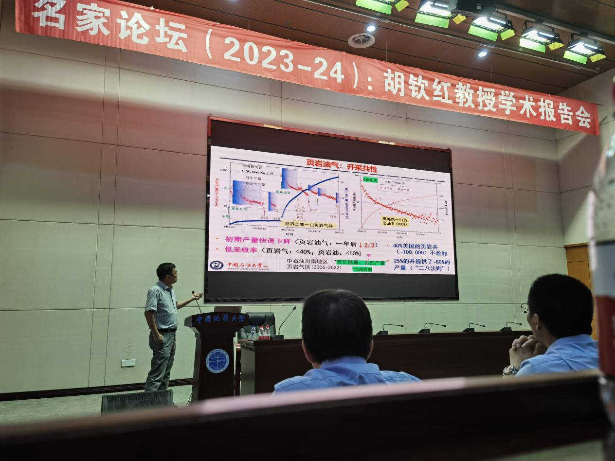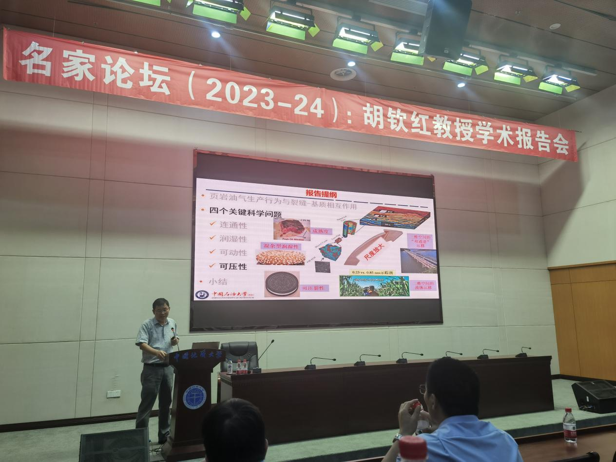 本次报告中,胡教授和与会师生分享了他近些年的研究成果和心得体会,介绍了在双碳目标下的能源之路,如何提高清洁能源(如页岩油气)的高效勘探与有效开发,重点对非常规页岩油气的生产行为与裂缝基质相互作用是如何影响采收率进行了详细介绍,本次报告聚焦页岩连通性、润湿性、可动性和可压性等关键科学问题与页岩油气流动运移及其如何影响页岩油气的开采行为进行了详细介绍。胡教授的报告让与会者更深入地了解页岩油气地质相关领域的最新进展以及未来发展趋势,多位参会的研究生与胡教授就页岩油气的渗流、页岩储层表征技术、双碳目标下油气地质如何发展等问题进行了讨论,最终报告在师生热烈的掌声中圆满结束。