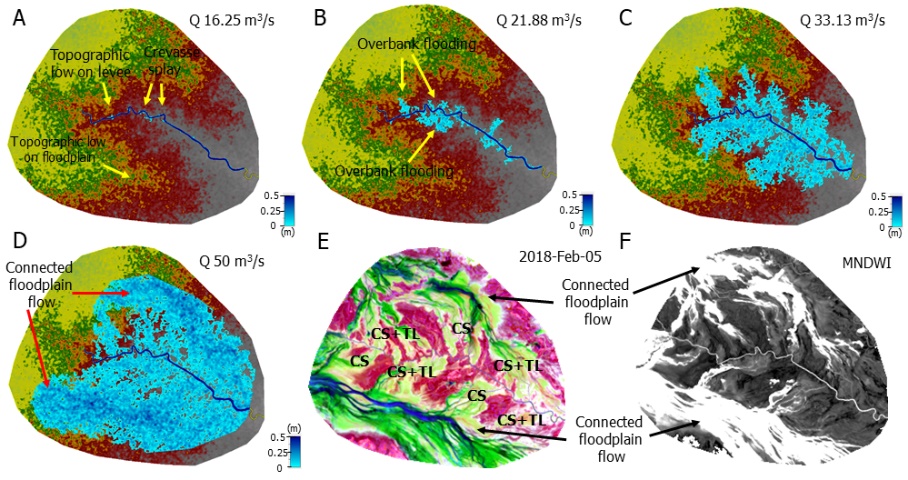 图3 A-D模拟随着水流量增大洪水漫溢过程,E为Landsat 8 的假彩色图,F为MNDWI的结果