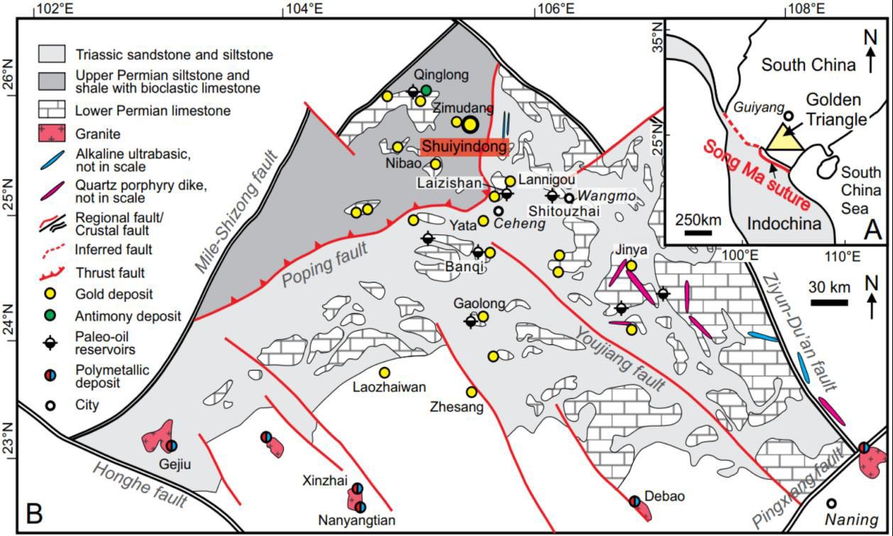 我国西南右江盆地中发育了大量赋存于沉积岩中的金矿床(图1),其矿化地质特征与卡林型金矿床具有诸多相似之处,被认为是目前除了美国内华达地区以外世界上最大的卡林型金矿矿集区。近期,Beats365唯一官网入口(武汉)李建威教授团队的靳晓野助理研究员利用稀有气体同位素和LA-(MC)-ICP-MS方解石U-Pb测年法分别对该地区的典型金矿床开展了矿床地球化学示踪和成矿年代学研究,旨在为区域及其他地区卡林型金矿床的矿床成因研究提供新的思路或借鉴。