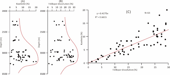 图2杭锦旗地区下石盒子组致密砂岩储层自生高岭石与长石溶蚀孔隙含量关系