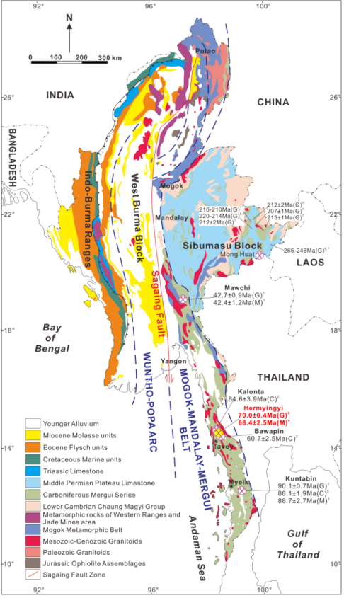 东南亚锡钨成矿带是一条长约2800km、宽约400km的狭长带,北起缅甸东部,向南经泰国进入马来西亚,止于印尼的邦加、勿里洞岛,是世界上锡(钨)资源丰富、产锡量最大的成矿带。带内的金属矿化以锡为主,局部显示出强烈的钨矿化,矿体以砂锡矿和原生锡钨矿的形式产出。原生锡钨矿的矿化类型包括石英脉型、云英岩型、矽卡岩型等,主要发育在缅甸境内(图1),从缅甸中部的抹谷(Mogok)向南延伸至泰国西部的普吉岛(Phuket),更南端可能到达苏门答腊北部地区,向北则与我国的腾冲锡矿带相连。然而,人们对东南亚锡钨矿床的成因研究较为薄弱,尤其是在成矿时代、成矿流体和成矿物质来源、成矿流体演化和矿物沉淀机制等基本问题上缺乏系统而深入的研究。