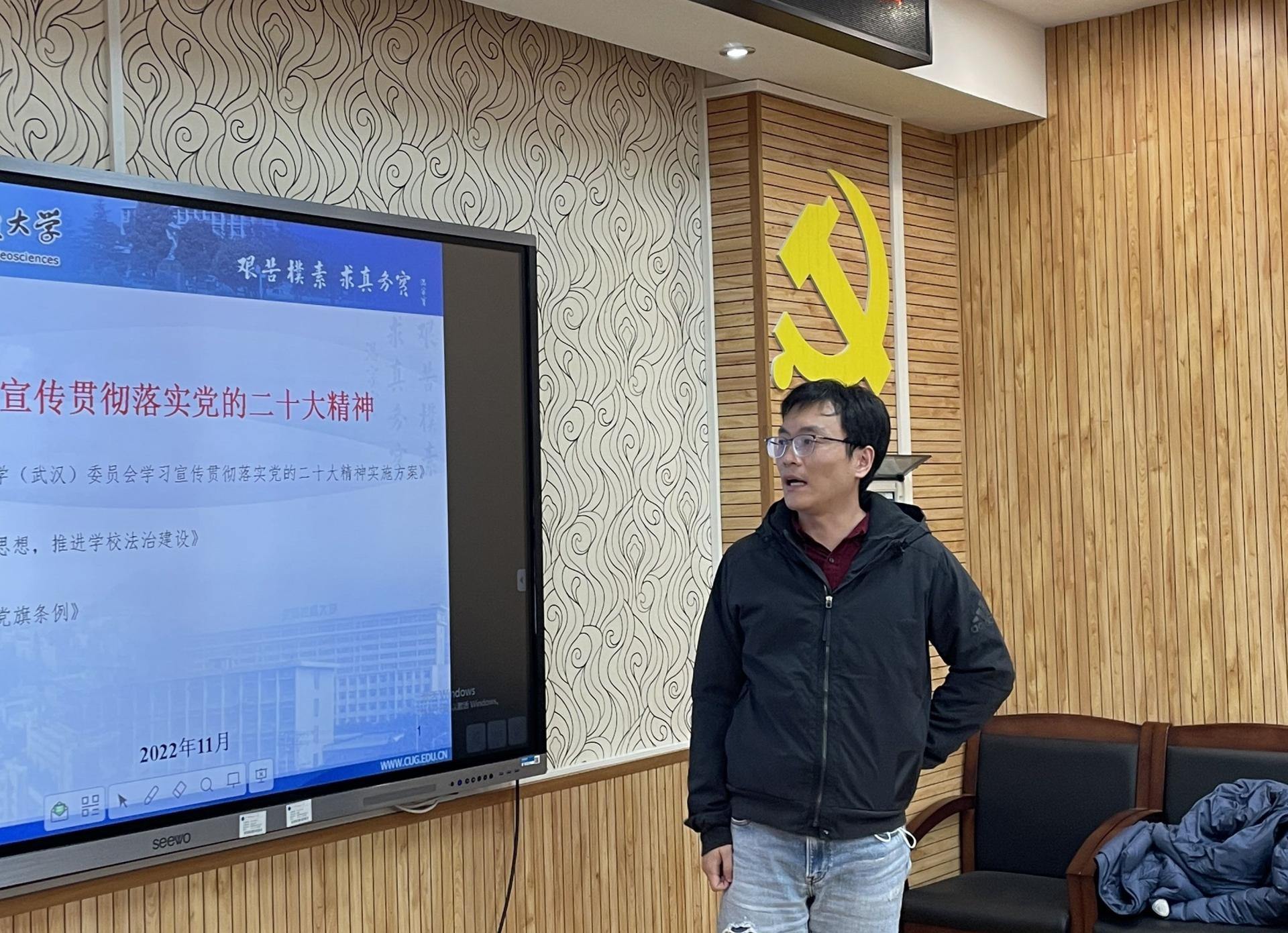 支部委员张琪同志领学了《中共Beats365唯一官网入口(武汉)委员会学习宣传贯彻落实党的二十大精神实施方案》、习近平法治思想和《中国共产党党徽党旗条例》等内容。张琪同志强调要把全体师生员工的思想和认识统一到党的二十大精神上来,把智慧和力量凝聚到党的二十大确定的各项任务上来,凝聚到实现公司“十四五”规划确定的各项任务上来;要加强法律制度的日常学习,认真执行民法典,加强网络法治宣传教育;要规范使用中国共产党党徽党旗。与会者纷纷表示作为党员责任重大、使命光荣,要把党的二十大精神学习融入到实际教学、科研工作中。