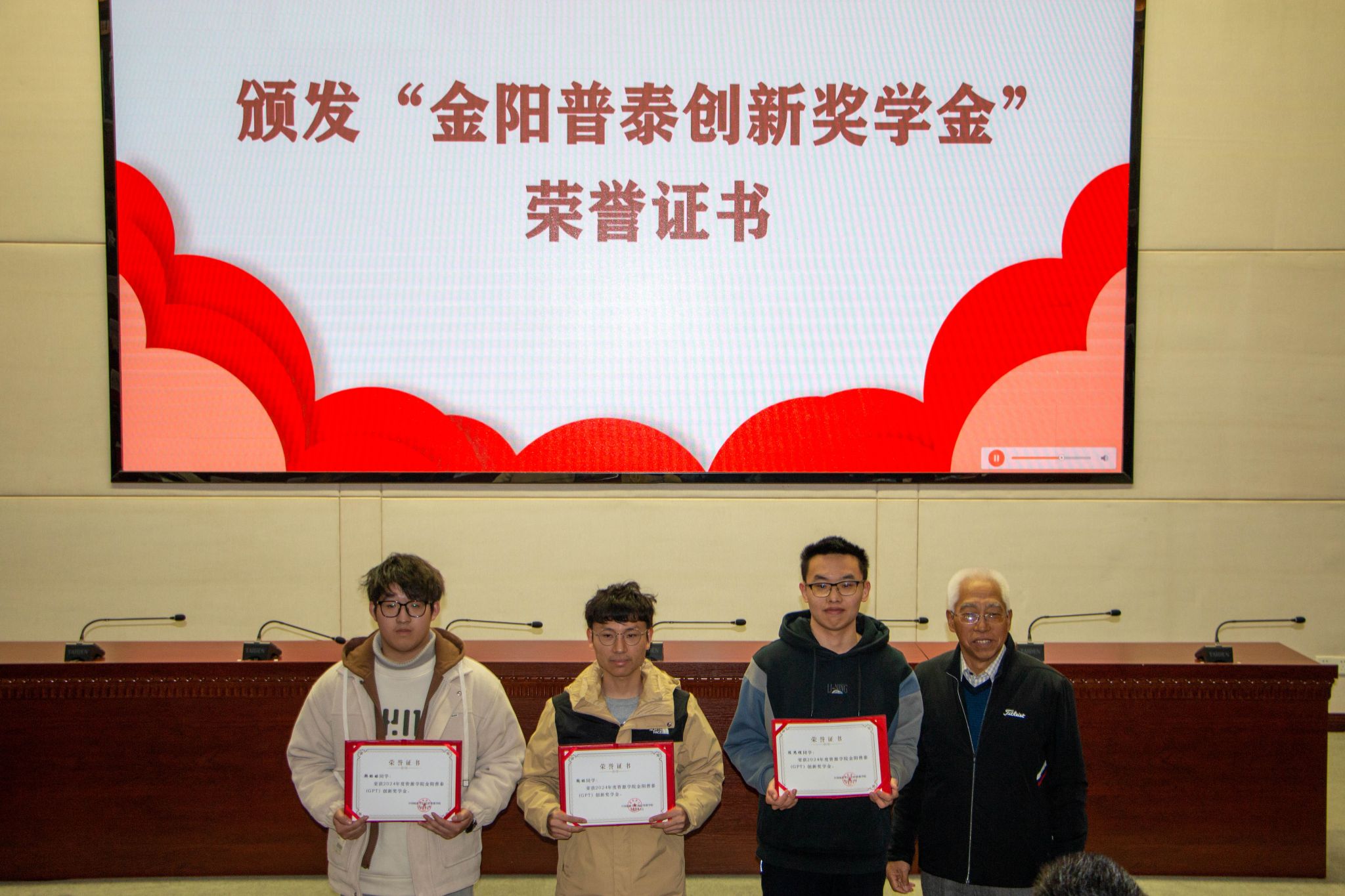 秦志军董事长为金阳普泰创新奖学金获得者颁发荣誉证书。