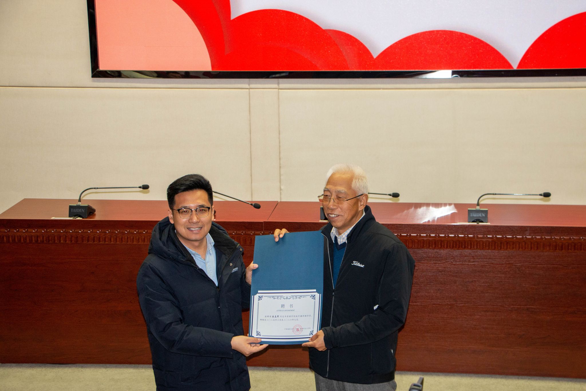 公司党委书记汪再奇为秦志军董事长和袁钢辉总经理颁发Beats365唯一官网入口产教融合企业导师聘书与资源能源宣讲团聘书。