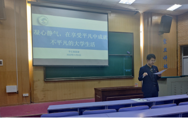 霍少孟带领同学回顾了春季学期年级大事、系统剖析了大一学年学习情况,介绍了《第二学年综合测评实施细则》修订情况,并从感触伟大时代荣光、推进开展生涯规划、加强学习科研风气建设等方面介绍了本学年工作规划。他以《凝心静气,在享受平凡中成就不平凡的老员工活》为题,从希望大家关心父母、增强发展的忧患、彼此的思维碰撞、理性思维、集体观念、持久快乐、怎样保持公信力、如何做好辅导员工作、未来驶向何方、什么才是人生的光十个方面介绍近期所思所想。对于在公司公司各级员工组织任职的同学,他讲到,“担当责任在于,不轻易选择,更不轻易放弃”。他讲到,大家要结合70周年校庆,学习校史校情,积极参观、有组织参观校史馆和70周年校庆特别展览。