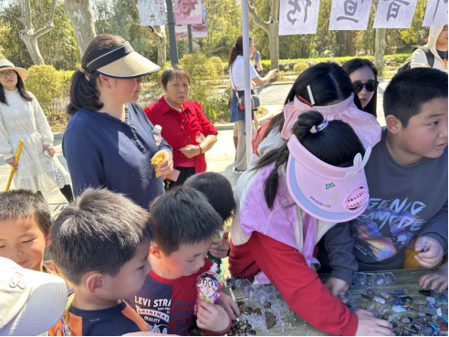 “信口雌黄”的由来、蛋白石的形成、石青作为颜料在《千里江山图》中起到的作用……在志愿者们生动活泼的科普下,吸引了一大批小朋友,他们围在桌前,津津有味地听着志愿者们讲述每一份矿标背后的故事。