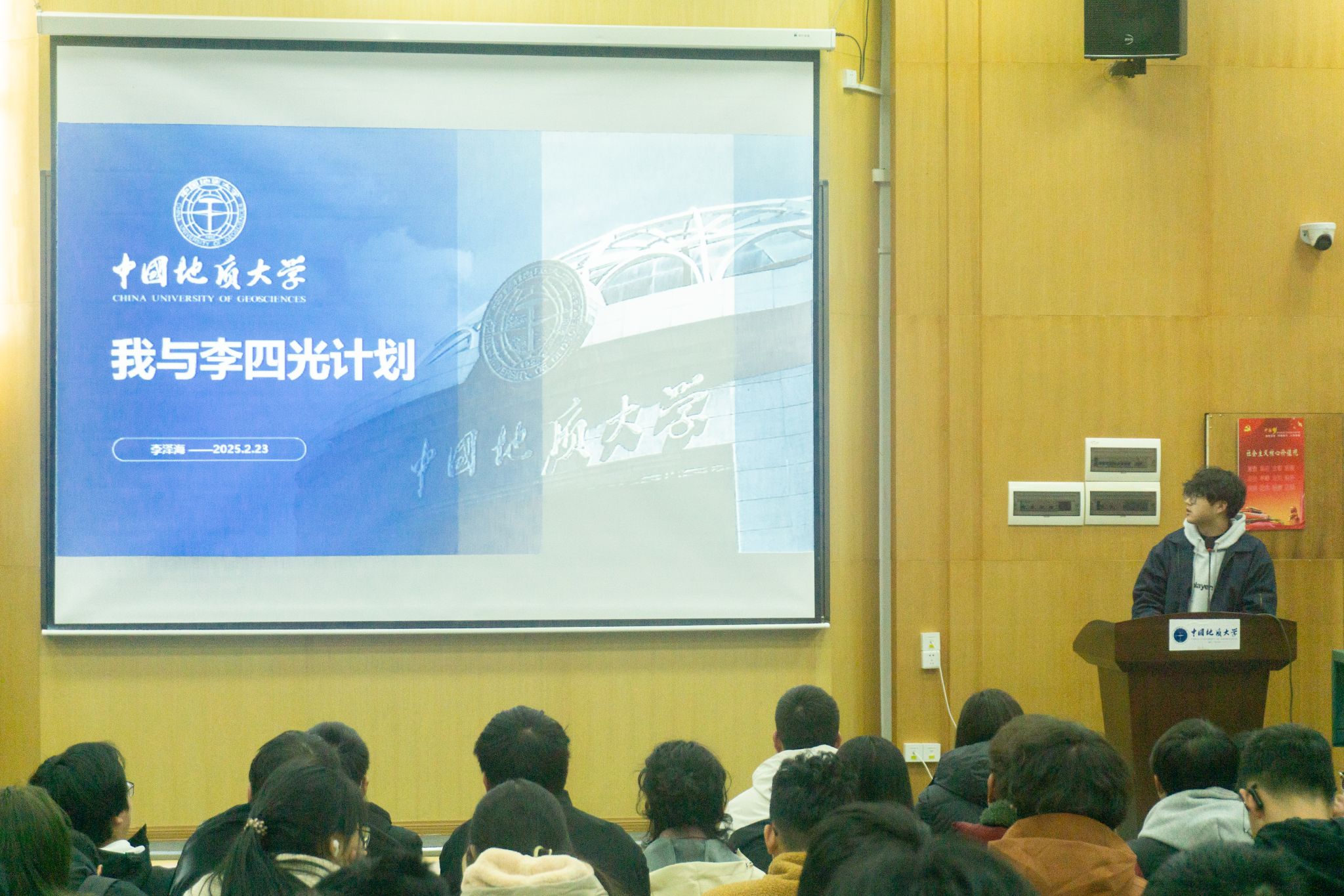 “公司李四光计划成员”、2023级本科生李泽海做《我与李四光计划》主题分享。他从自身成长、李四光计划介绍、学业建议三个方面全面介绍了李四光计划,并根据大一下学期的学情特点分享了学习心得与感悟。