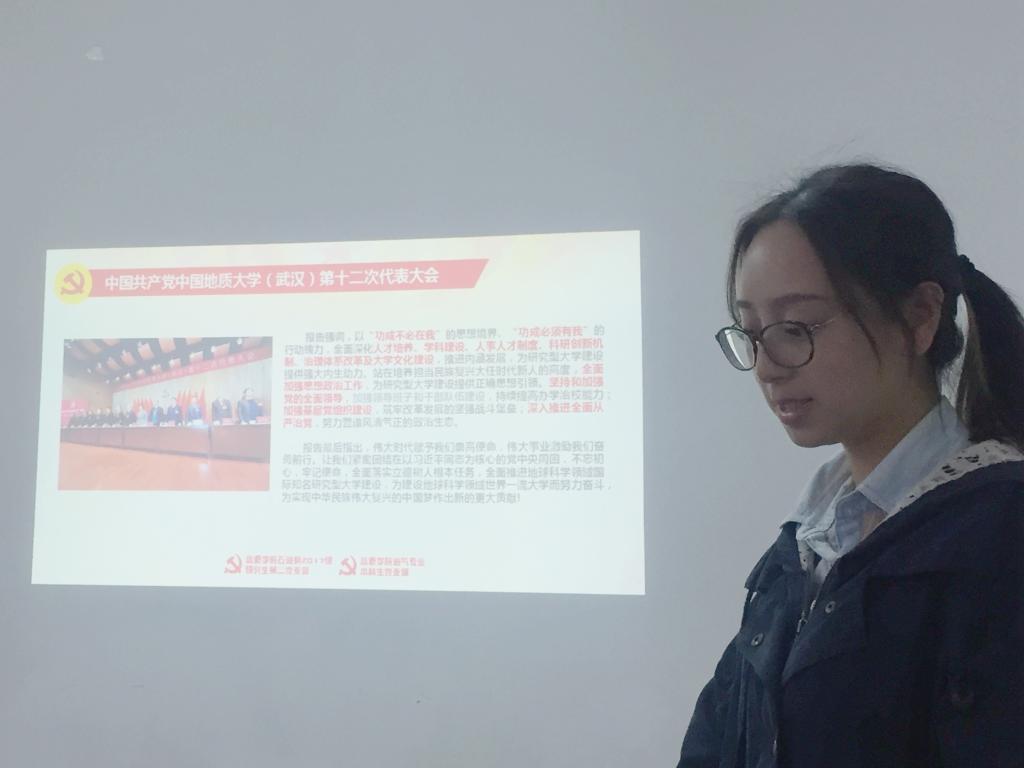 石油系2017级研究生第二党支部书记程璇同志带领大家一起学习了公司第十二次党代会精神,包括会议主题、会议报告提纲以及提出的奋斗目标等内容,并提出与会党员应充分发挥先锋模范作用,为建校一百年时实现“建成地球科学领域世界一流大学”的地大梦添砖加瓦。