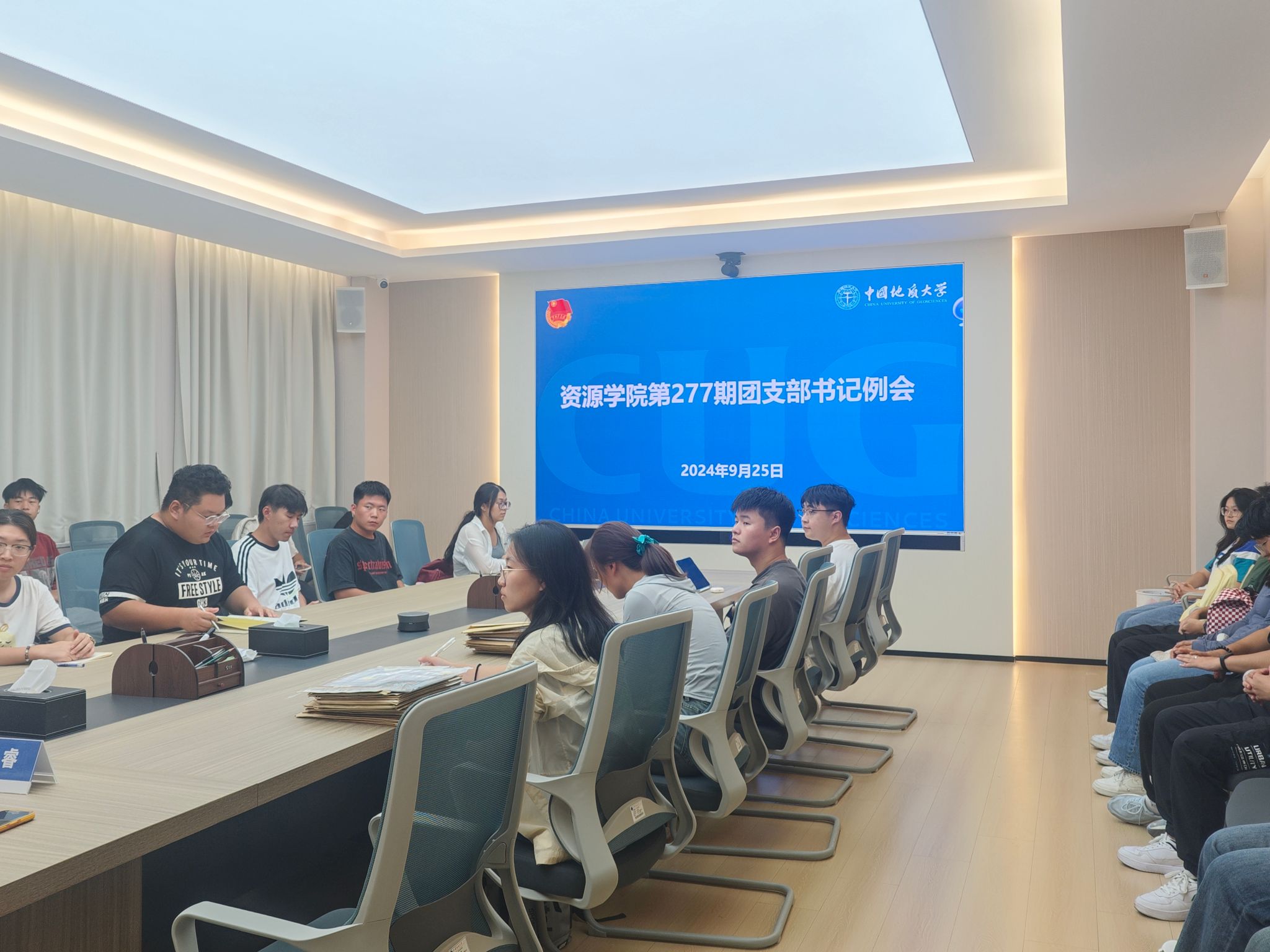 会议就九月主题团日的系统录入、“我与国旗合张影”、2024级新生归档等工作进行了布置。