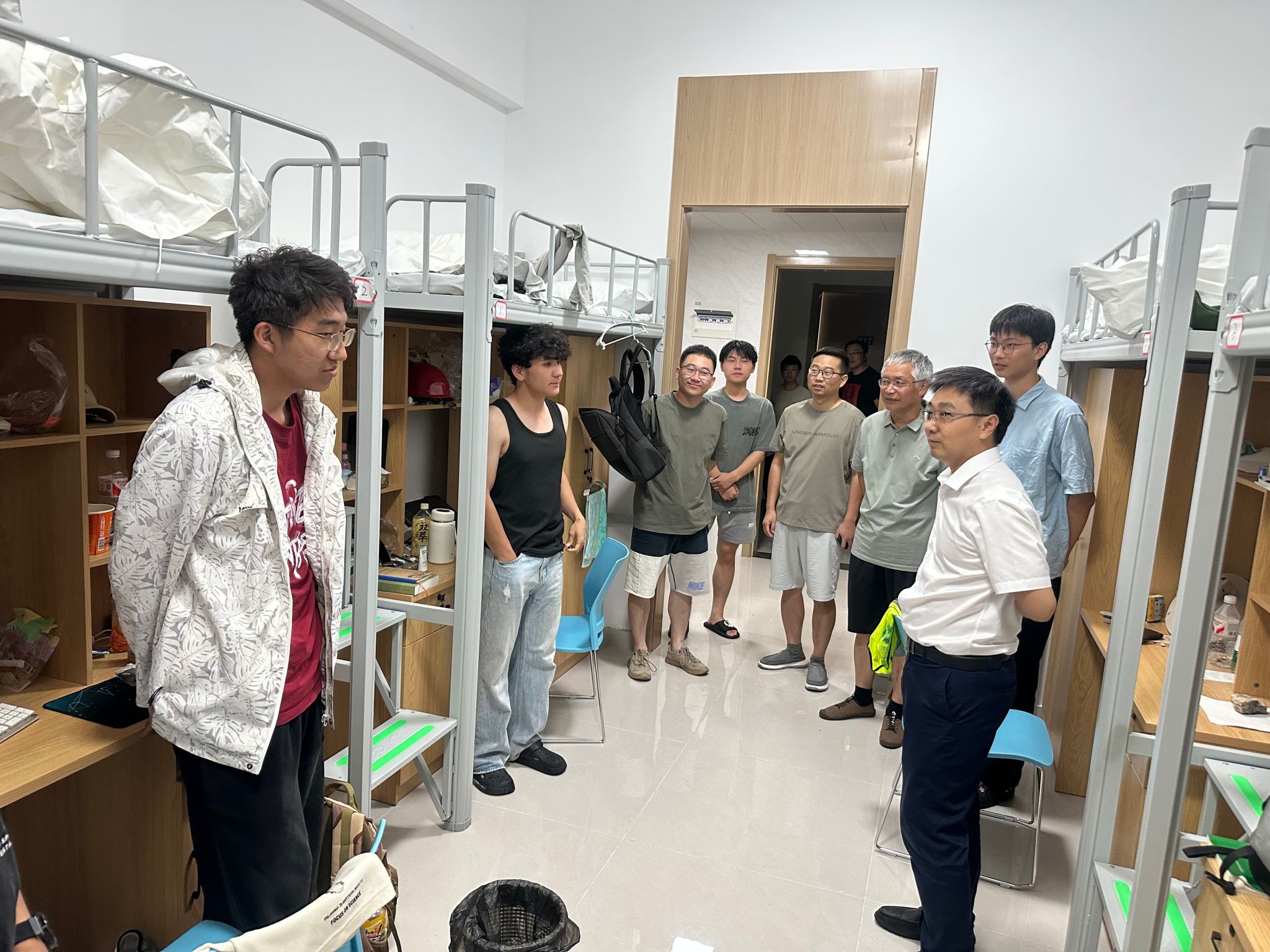 汪再奇一行在教职工宿舍、员工宿舍看望慰问实习师生,了解野外教学安排与进展,细致了解了师生在基地的生活学习情况。他充分肯定了实习师生在野外实践教学中的表现,赞扬了野外教学团队在野外教学中充分融入思政元素的做法。他叮嘱教学团队一定要高度重视野外教学实践的安全,把安全放在重中之重,平稳顺利完成威海教学实习。他勉励同学们,要强化野外实践工作基本功,按照教学计划扎实完成野外实践中的各项任务,磨砺意志品质,为未来从事工作打下素质基础。