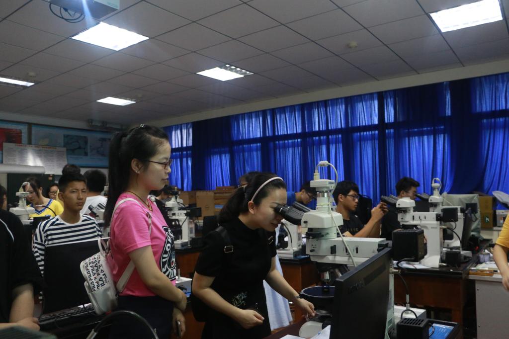 7月11日上午8:30,“体验地球科学之石头会说话”在主楼330、332实验室开展。江满容老师和刘安璐老师指导员工进行镜下光片鉴定和矿石标本观察。通过观察和实践,营员们了解了基本的矿石类型及矿产资源在国民经济发展中的重要作用。