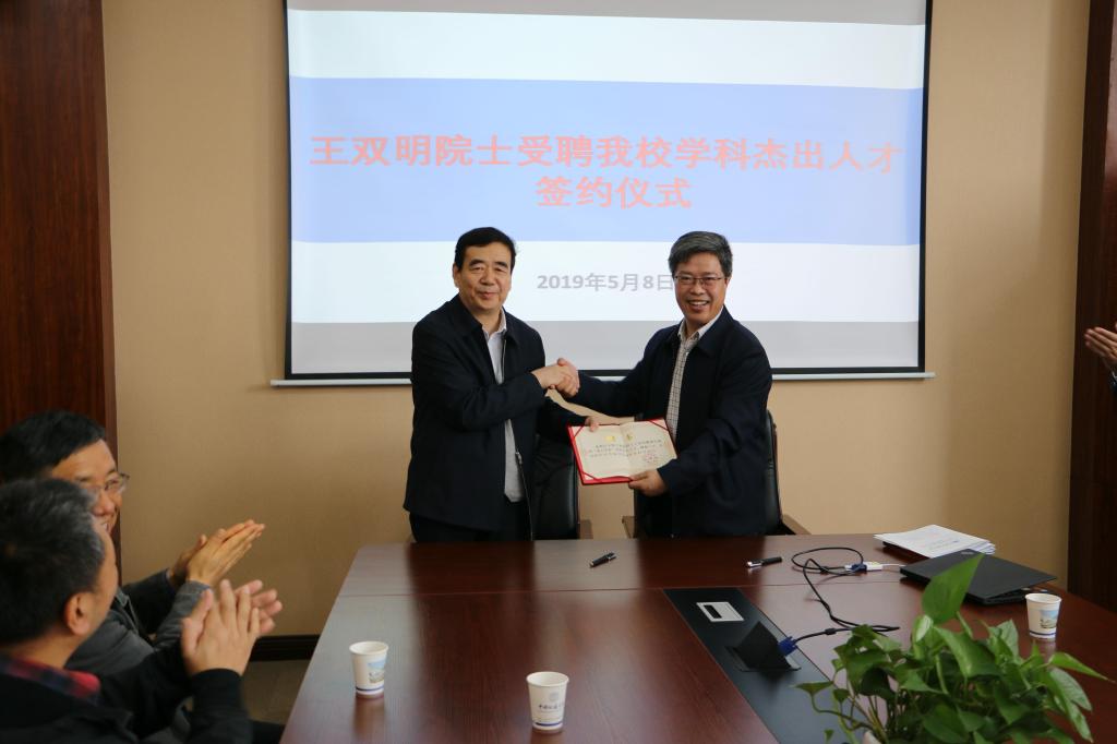 5月8日上午,中国工程院院士王双明受聘公司杰出人才签约仪式于东区教学综合楼B702举行。副董事长王华,党委人才工作办公室常务副主任周刚,公司党政领导班子成员、盆地矿产系全体教师参加签约仪式。公司党委书记李宇凯主持签约仪式。