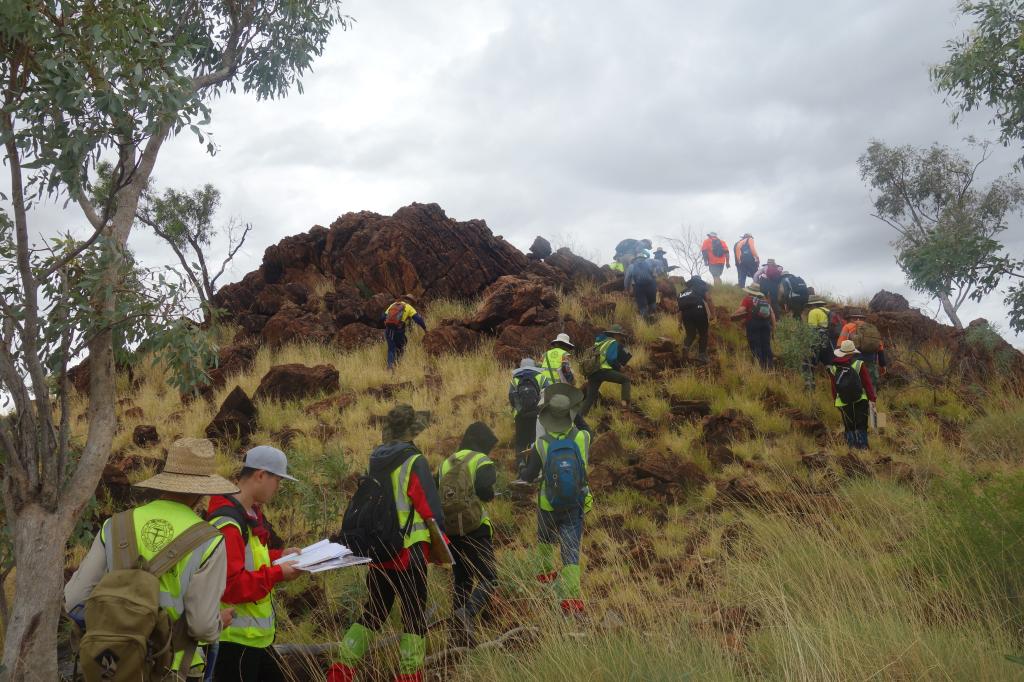 第二阶段,时间为7月15日至7月22日,实习在芒特艾萨中部地体玛丽凯瑟琳(Mary Kathleen)地区进行。此阶段实习内容侧重于沉积序列、岩浆活动、矽卡岩化及成矿活动,填图难度增强。该阶段第一天老师带大家对实习区进行简单踏勘,认识典型地层、特殊构造和蚀变现象等。此后大家以小组为单位对实习区开展了独立填图工作。此阶段实习还对实习区的沉积序列进行了考察,并绘制了沉积序列柱状分布图。