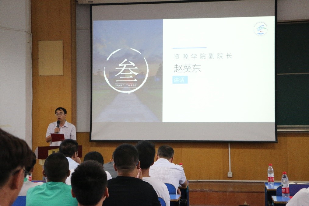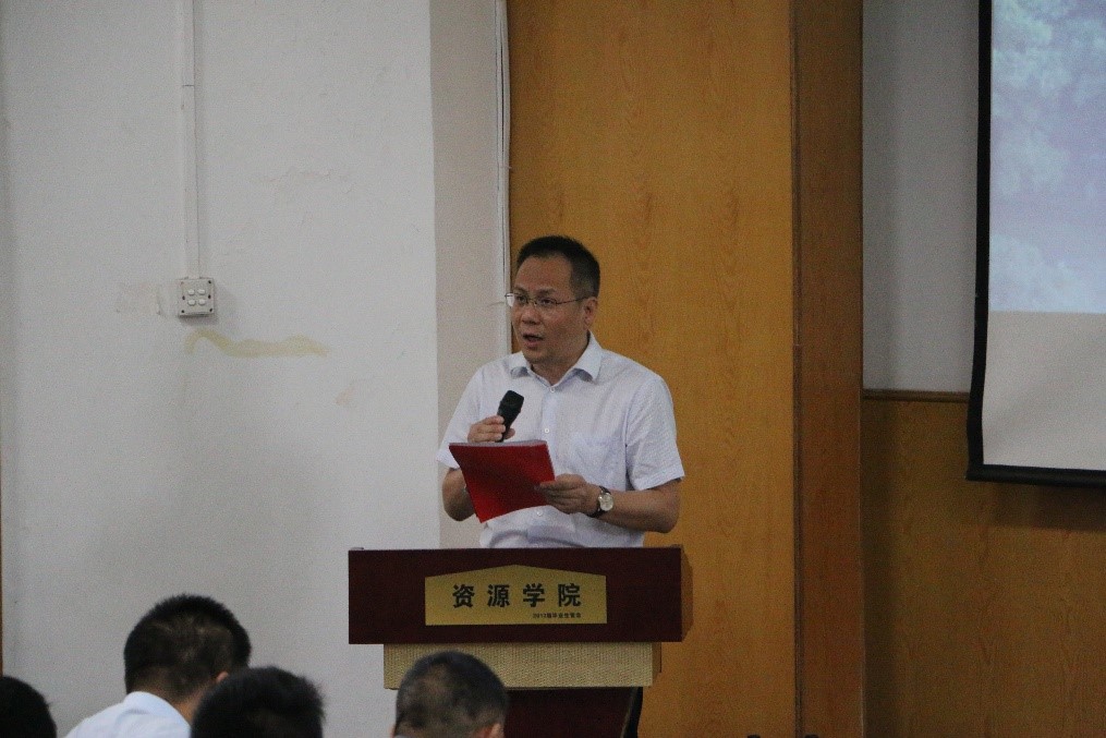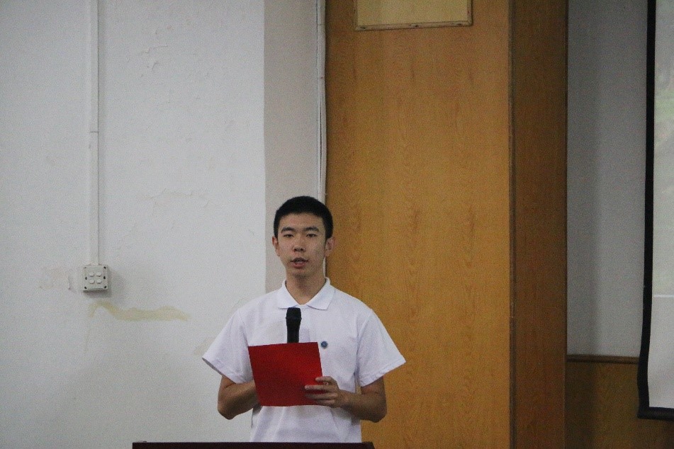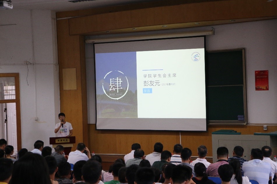 2019届员工会主席彭友元发言。彭友元将自己充实奋进的老员工活与新生分享,鼓励新生要养成自律的习惯、制定自己的目标、培养地质人的情怀。以激情、规划、兴趣三个关键词为主题,将自己大学成长的感悟与本科生进行分享。