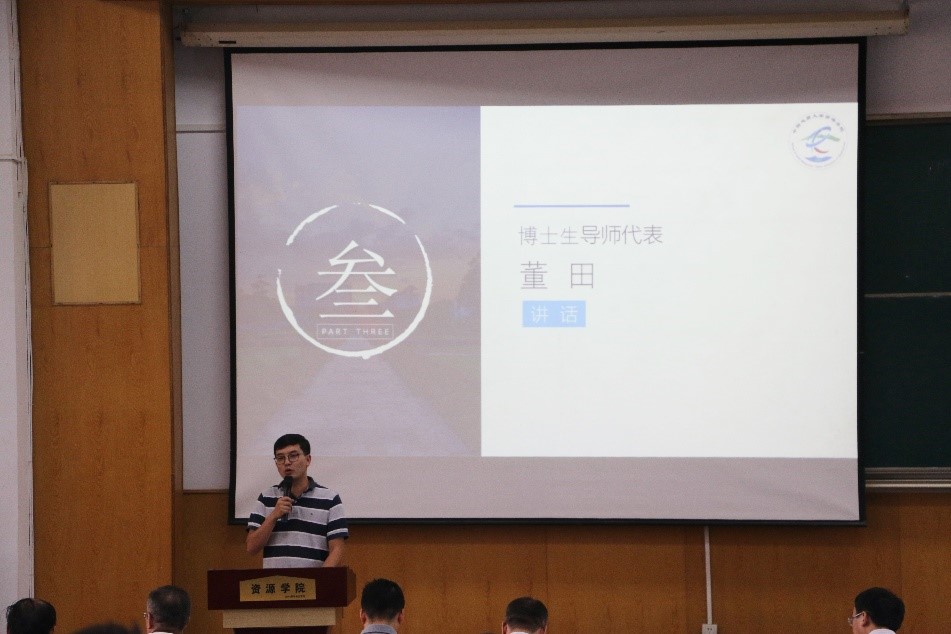 博士生导师代表董田老师勉励大家要明确目标;培养专业兴趣,形成金字塔式的基础知识结构,尽快进入研究状态,找到科学问题,大胆质疑,认真求证,诚实做人,踏实做事,以最好的状态迎接即将到来的生活。