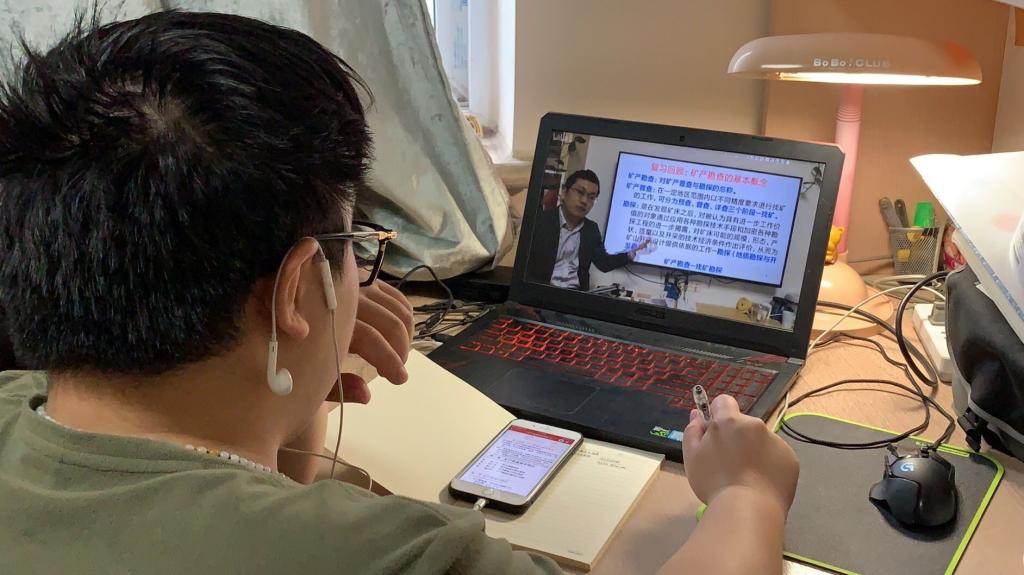 员工在家用电脑观看《矿产勘查理论与方法》课程直播,同时用手机看PPT和做笔记