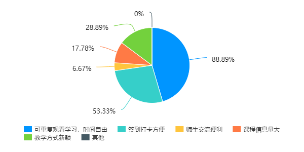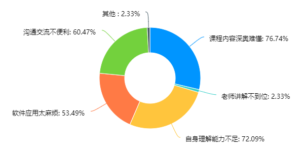 从与线下课程的比较来看,88.89%的同学认可线上课程在“可重复观看,时间自由”比线下课程更具有优势,而超过半数的同学认为线上课程签到打卡方便,还有少部分同学认为师生交流便利、课程信息量大以及教学方式新颖也是本门网课的优点所在。不过,也正是因为课程信量大,有82.22%的同学同时认为该网课重点太多难以消化,同时有近一半的同学认为软件使用不太方便,而且由于内容太多很难及时收到学习成果的反馈。此外,还有同学写道,电子版的教材使用依旧逊色于实体教材,而自己有什么问题也无法和老师及时沟通,若是在公司可以当面问老师。也有极个别同学反映自己的网络状态不稳定,如果卡顿了一会之后很难再接续上思路,只能靠自己摸索,同时签到系统偶尔也会出bug,明明签到了却显示没有签到。