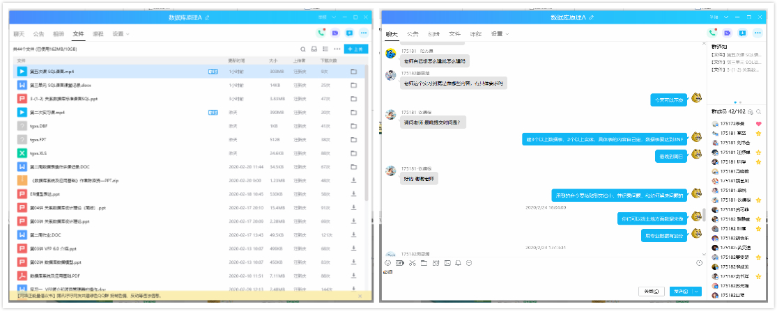 QQ作为一个即时通讯软件是十分强大的,建立QQ群组的方式是整合员工意见、与员工交流沟通的重要途径。在建立的课程群里,每位同学都要将自己的昵称改成学号+姓名,从而防止闲杂人等鱼目混珠。这样做既保证了QQ群里良好的教学秩序,也让有问题的同学能及时和老师对接,反馈的问题也能在群里共享给其他成员。此外不选择微信群而选择QQ群还有一个重要原因就是在QQ群里发送的文件、聊天记录能被上传到云端保存,方便同学随时下载查看,不像微信群的文件和消息记录都会随着缓存删除而消失。