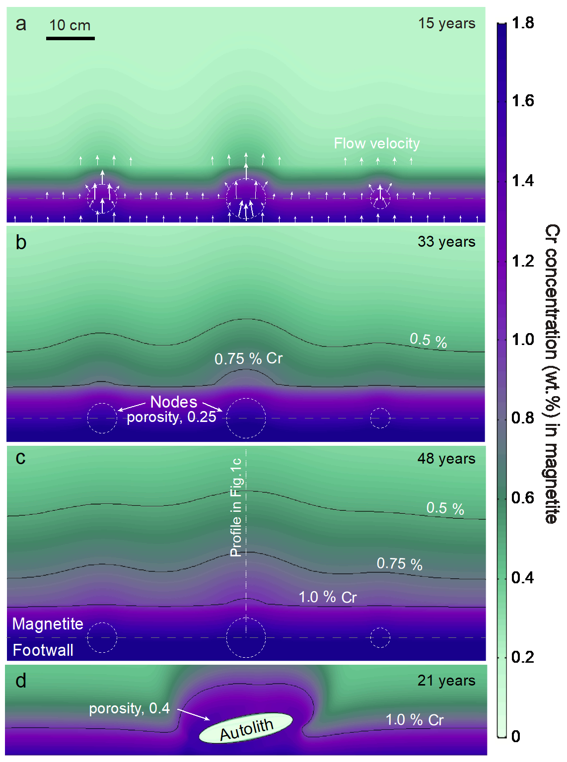 南非布什维尔德岩体是陆地上出露规模最大的层状岩体,上部含多个磁铁矿层,产出了世界上规模最大、品位最高的钒钛磁铁矿石,但有关磁铁矿层的形成机制及成分演化规律,却一直没有得到很好的解释。本项研究从岩浆房晶粥模型出发,厘定了磁铁矿晶粥层的矿物堆积过程和颗粒间熔体的对流,同时借助有限元数值模拟,查明了从下覆岩层中溢出的富铬熔体穿过磁铁矿晶粥层的向上渗滤过程。由于晶粥中流动的熔体不断与周围磁铁矿发生反应并达到化学平衡,从而改造了磁铁矿石中铬元素的含量。相关模拟结果与野外磁铁矿层剖面中铬元素的分布特征高度吻合,表明晶粥中的岩浆动力学过程在磁铁矿层的形成和演化中发挥了重要作用。