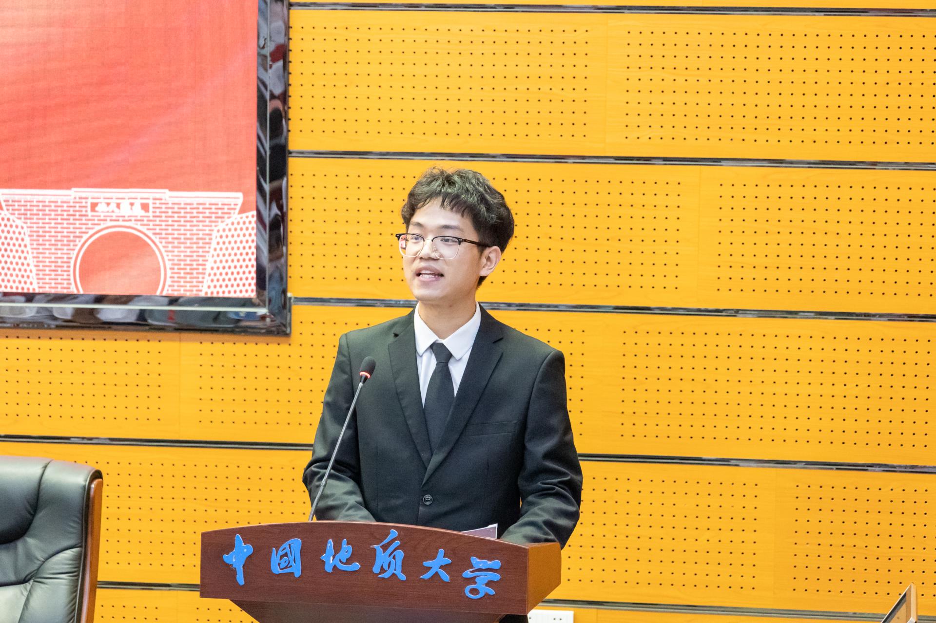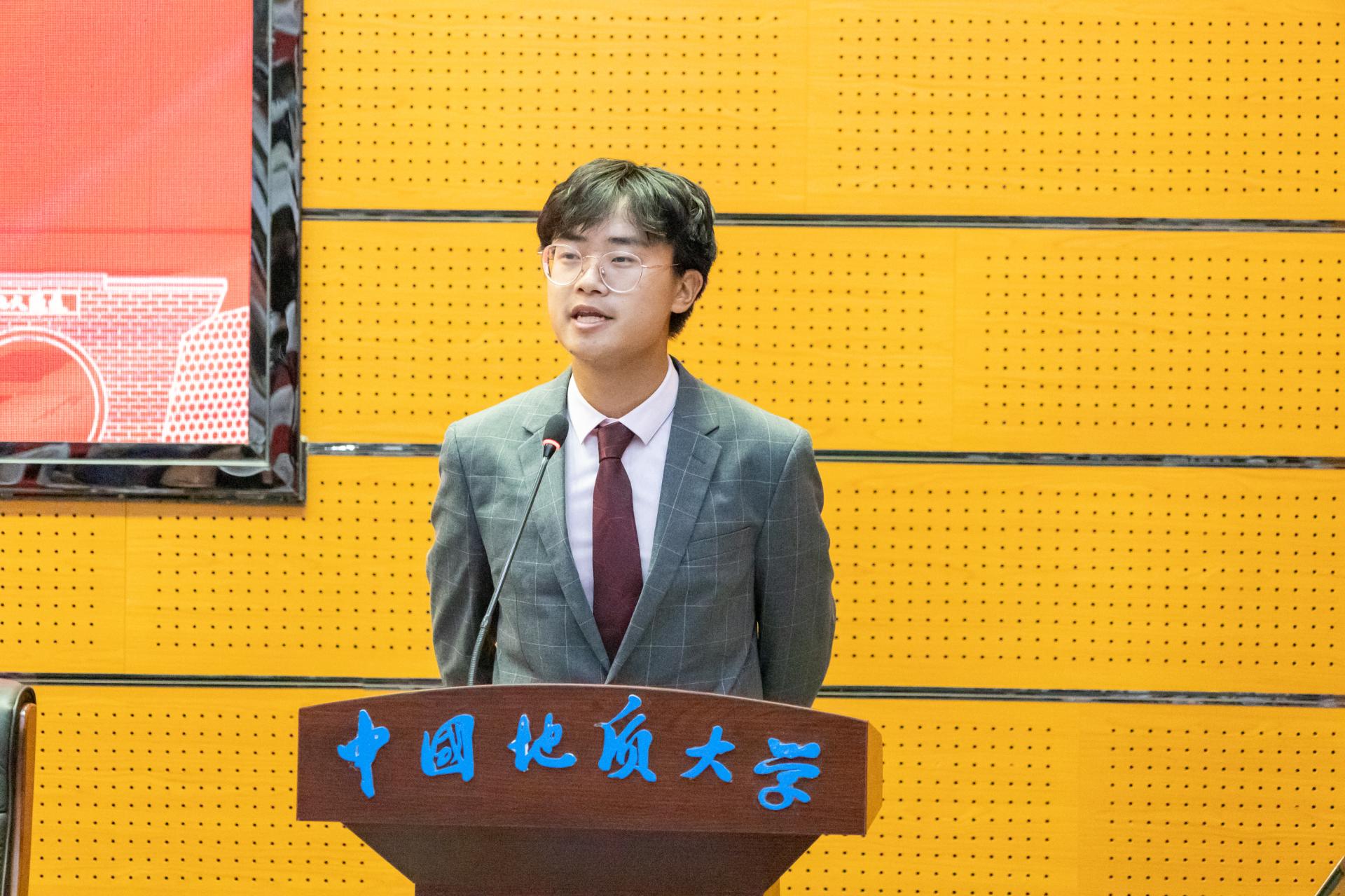 新生代表、021221班孔甘霖同学分享了自己与地大结缘的故事以及入学以来的感受,畅享了未来的老员工活,倡议同学们立足于时代要求,着眼于全球大势,锐意进取,激流勇进,做永不停息,无所畏惧的后浪。