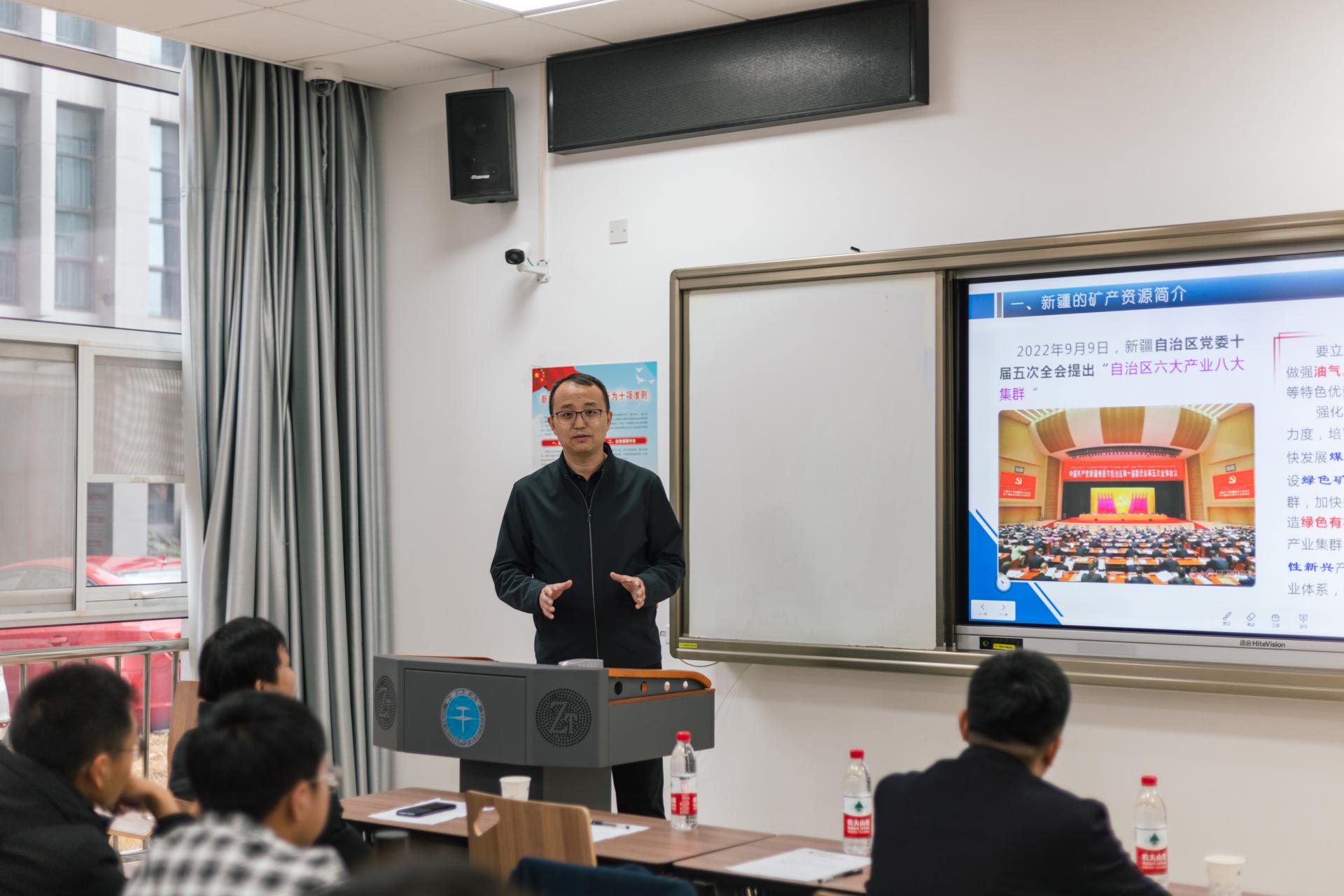 马小平深情回忆了大学时响应号召,积极参加了新疆地矿局“西部计划”第一届定向生培养,毕业后入职第九地质大队,12年扎根找矿一线的奋斗历程和不凡业绩,分享了几段精彩的地质找矿故事。他表示,作为地大人、资源人,自己始终践行为国找矿初心,在巍巍山脉、雪域高原上标定人生方位,用奋斗铸就了无悔的人生。工作期间,他勤于钻研,不断提升知识水平和业务技术,先后入选新疆少数民族科技骨干特殊培养计划、少数民族研究生高层骨干人才计划,回到母校继续攻读硕士和博士学位,系统学习地质找矿的新理论、新技术、新方法。他祝愿和勉励学弟学妹,珍惜时光、努力学习、刻苦钻研,在投身国家能源资源事业中成就灿烂的人生。同时,他介绍了新疆矿产资源及能源矿产概况、新疆地矿集团及吐鲁番金源矿冶有限责任公司的历史沿革、找矿成果、科教实力、引才政策和发展规划,热情欢迎学弟学妹们加盟。