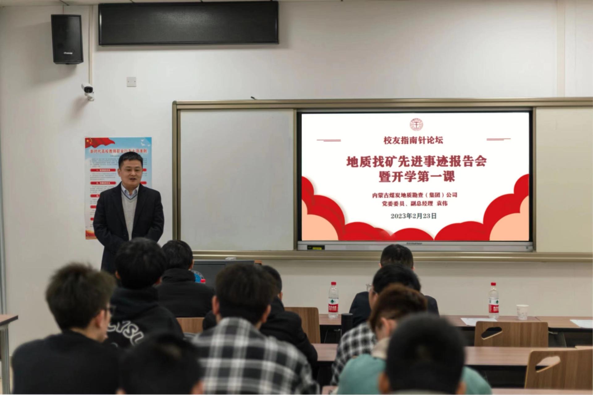 袁伟通过讲述在大学刻苦求学、毅然二次择业奔赴内蒙古地勘行业以及担任内蒙古煤炭地质勘查(集团)公司副总经理的三段经历,分享成长故事和人生感悟。他号召同学们要珍惜在大学的宝贵学习机会,坚定理想信念,锤炼专业本领,提升综合素质,响应党的号召和国家能源资源事业发展需要,传承发扬“艰苦朴素、求真务实”的校训精神,争做有理想、有能力、有担当的新时代地质工作者,把青春华章写在祖国大美河山。
