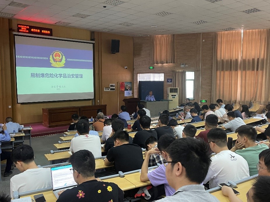 叶峰中队长做《易制毒化学品普法讲座》,肖兵警长做《易制爆危险化学品治安管理讲座》,系统为广大师生讲解易制毒易制爆化学品的界定,解读《危险化学品安全管理条例》,危险化学品的管理指南等基本理论常识,并结合高校实际并结合高校的特点讲解了实验室管制类危化品的管理,对使用危化品的师生提出了如实登记,做好台账的要求。