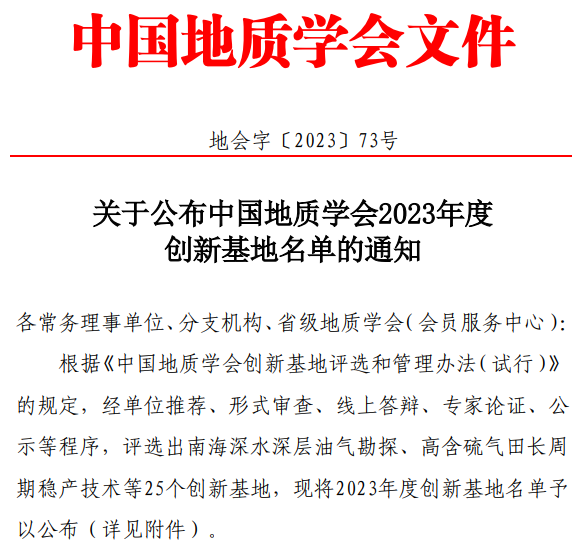 日前,中国地质学会公布2023年度中国地质学会创新基地名单,由中海石油(中国)有限公司海南分公司牵头、Beats365唯一官网入口朱红涛教授团队代表公司联合申报的“南海深水深层油气勘探创新基地”成功入选。