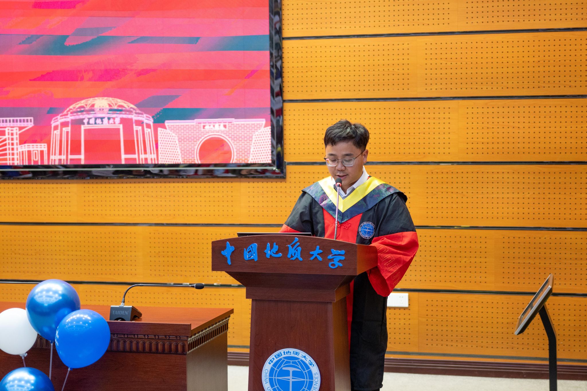 研究生毕业生代表徐赛发言。他结合在地大十年的求学经历分享了自身感悟。毕业后,他即将前往长庆油田,在为保障国家能源资源安全的最前线贡献青春力量,将在地大的所学所得全部熔铸在自己热爱的事业中。他以苏轼的两句词“莫听穿林打叶声,何妨吟啸且徐行”表达对毕业生的祝愿,希望大家走出“象牙塔”、直观地感受复杂多变的社会时,即便只有竹杖芒鞋,也要积极乐观、砥砺前行,搏击风雨、笑傲人生,关关难过关关过,人生漫漫亦灿灿。