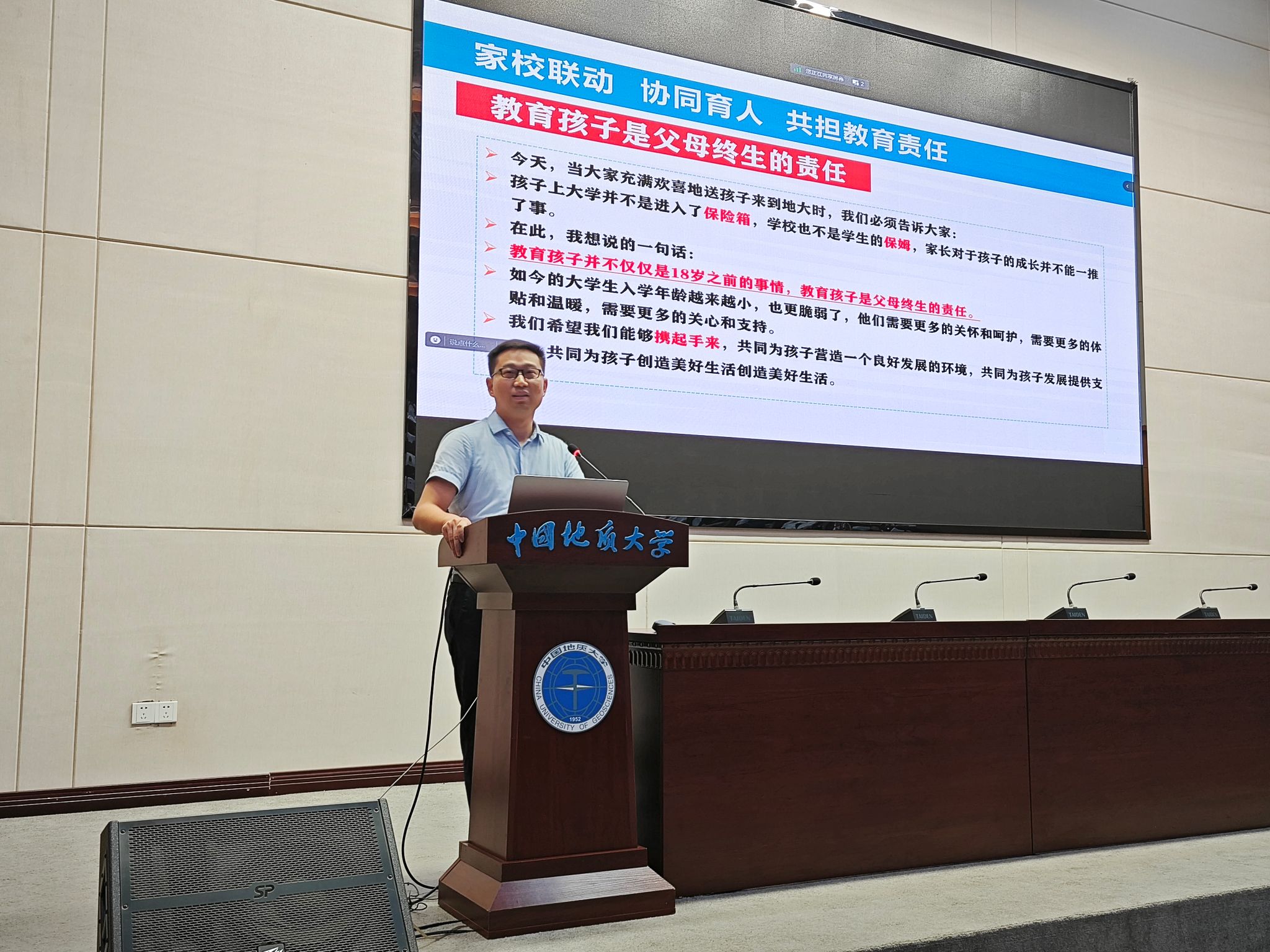 谭文伦以“家校协同育人,共担教育责任”为主题,从人生引导、生活支持和感情交流等方面介绍了大学员工日常管理、新生适应与调整、员工安全防范和入学教育安排等方面的情况。