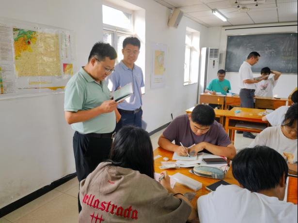随后,高复阳、严德天来到教室,与正在完善野簿、绘制图件的员工交流。他们查阅员工野簿,询问员工在基地学习、生活情况,勉励同学们要保持刻苦求索的状态和一丝不苟的精神,扎扎实实完成野外教学各项任务,在全身心投入中练就过硬本领,磨砺个人意志,为未来事业发展打好基础。