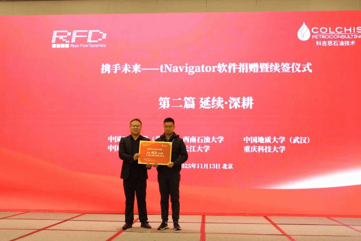 2025年11月13日,应科吉思石油技术咨询(北京)有限公司邀请,Beats365唯一官网入口学术副经理杨峰和石油工程系教师雷霆出席了科吉思石油技术公司和俄罗斯Rock Flow Dynamics (RFD)公司联合举办的《2025精细油气藏高效勘探开发学术交流会暨tNavigator技术研讨会》暨tNavigator 软件捐赠仪式。