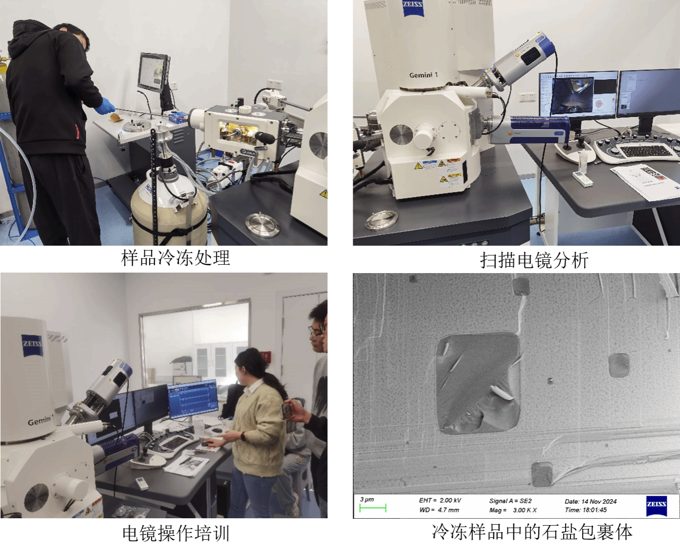 常规扫描电镜要求所观察的样品为固体,而液相包裹体化学元素成分无法定量测定,一些样品在干燥过程中会发生结构变化,致使无法观察其真实结构。冷冻扫描电镜技术能够对含水(流体包裹体)样品进行成像和化学组成分析,实现对于液态样品及不耐电子束损伤样品的微观形貌观察以及组成成分分析。