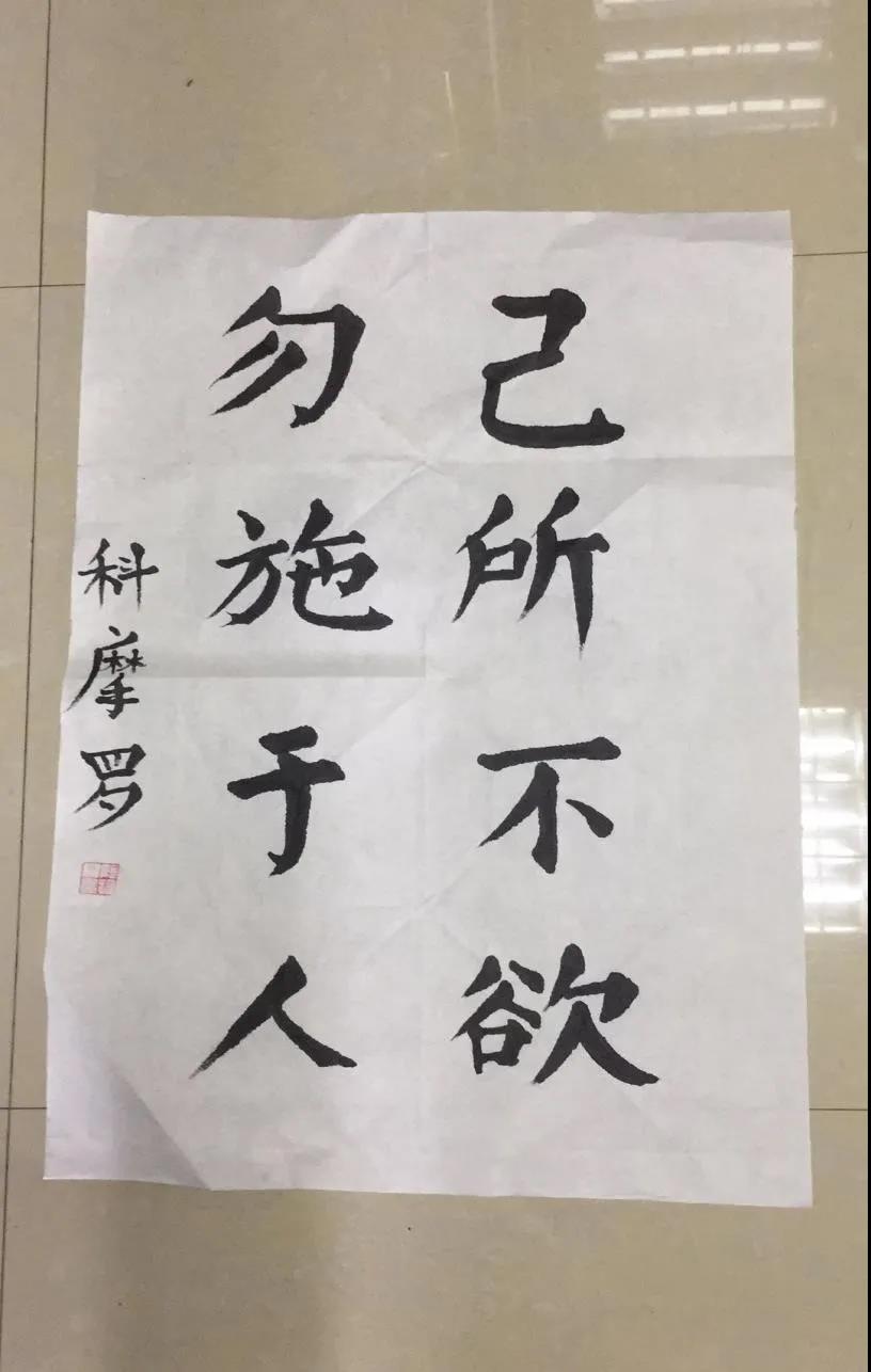 在地大求学时,除了固定的课程和实验外,阿拉丁每天的生活都是丰富多彩的,“我特别喜欢运动,一般周末的时候会和朋友们出去踢球,打排球等等。我也很喜欢中国的舞龙,以前还参加过我们国际教育公司的舞龙队。”值得一提的是,阿拉丁不仅中文说的特别好,他还特别喜欢中国的书法,并且特意展示了他书写的“己所不欲,勿施于人”。