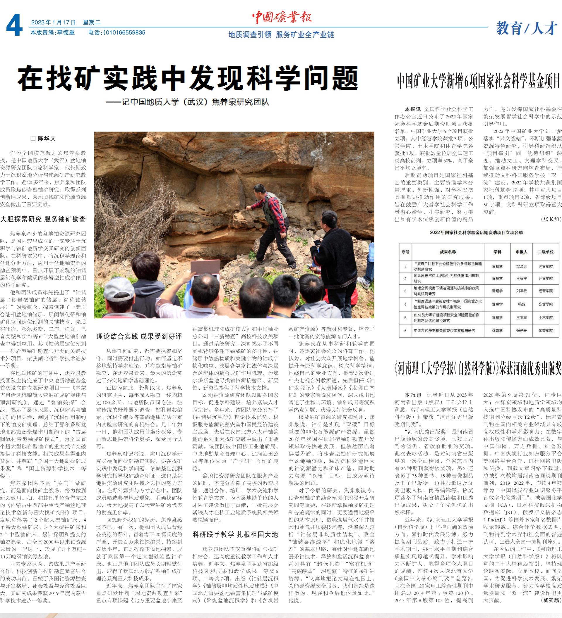 在地质找矿的征途中,焦养泉教授团队主持完成了中央地质勘查基金首次设立的专题研究项目——《内蒙古自治区杭锦旗大营铀矿成矿规律与预测研究》。通过“煤铀兼探”会战,揭示了层序地层、沉积体系与铀成矿的相关性,阐明了沉积作用制约下的铀成矿机理,总结了鄂尔多斯盆地北部微弱聚煤作用制约下的“古层间氧化带型铀成矿模式”,为全国首个超大型砂岩型铀矿的重大找矿突破提供了科技支撑。相关成果获得业内赞誉,并荣获“全国十大地质找矿成果奖”和“国土资源科学技术二等奖”。